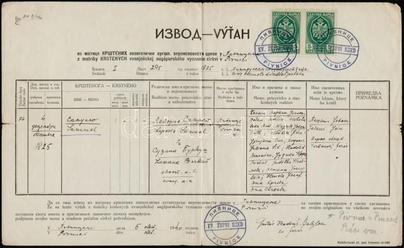 Beschreibung: Pincéd Bács v.m 1940 születési anyakönyvi kivonat jugoszláv okmánybélyegekkel