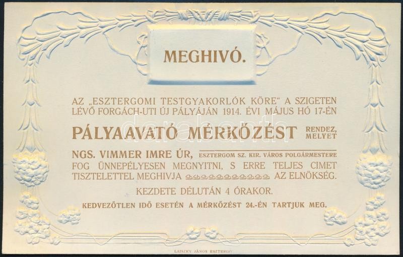 Beschreibung: 1914 Szecessziós meghívó az esztergomi sportpálya pályaavató mérkőzésére, szép állapotban