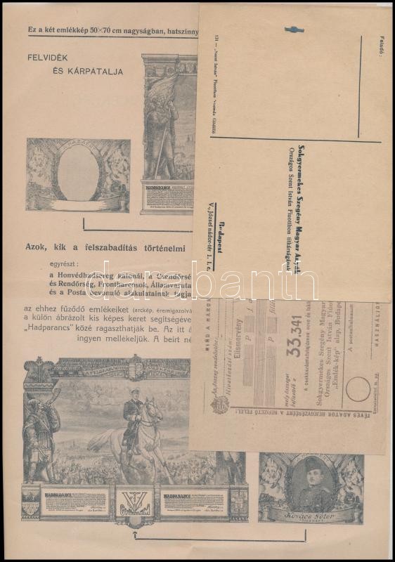 1943 Felvidék és Kárpátalja felszabadítása emlékére, a Stádium Sajtóvállalat Rt. által kiadott emléklapot népszerűsítő nyomtatvány, illusztrációkkal, 29,5x20,5 cm