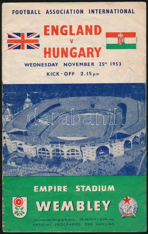 1953 Az évszázad mérkőzésnek hivatalos műsorfüzete. England vs Hungary. Wednesday November 25th 1953. Empire Stadium Wembley. Official Programme. Football Association International. London, 1953, Wembley Stadium Ltd. 18 p. Számos szövegközti és egész oldalas fényképpel illusztrálva. Kiadói, színes, illusztrált papírborítóban, 23x15cm