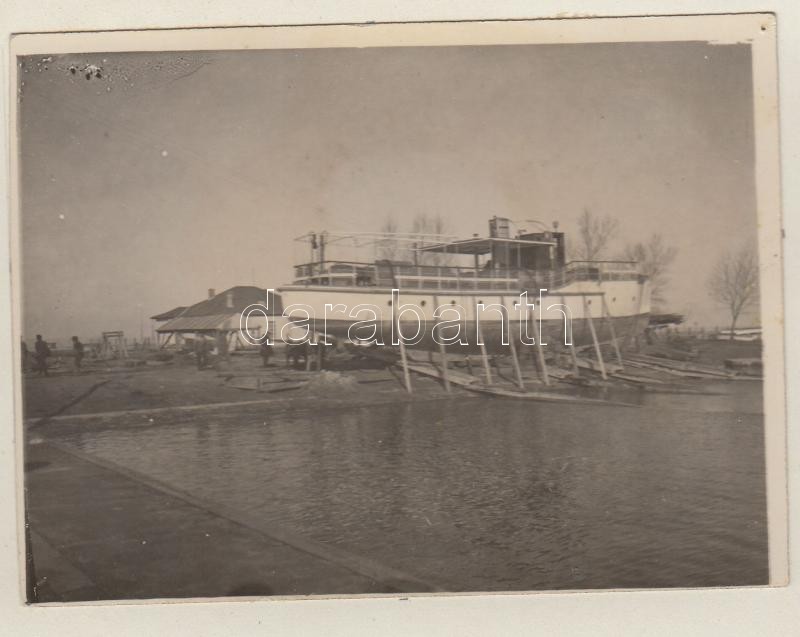 Beschreibung: 1929 Siófok, a Balatoni Hajózási Rt. Tünde motoros hajó javítás alatt a parton a MAC telepen, papírra ragasztva, hátoldalán feliratozva, 9x11,5 cm