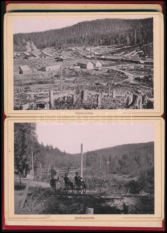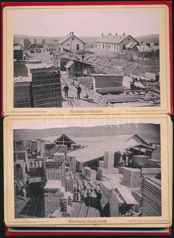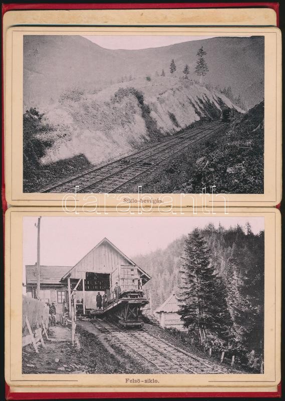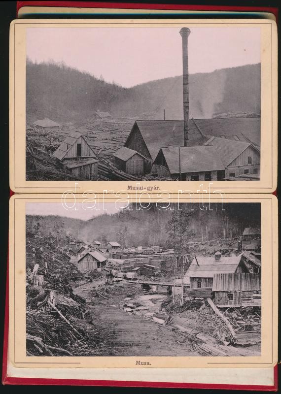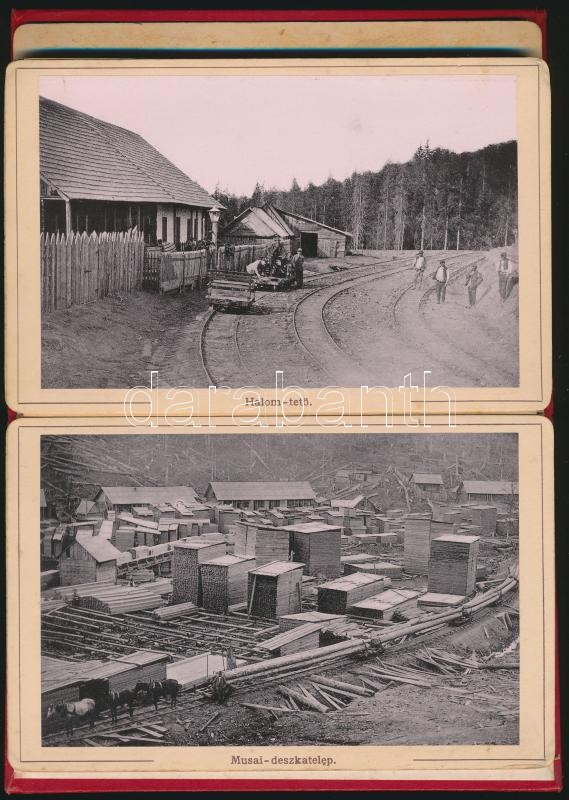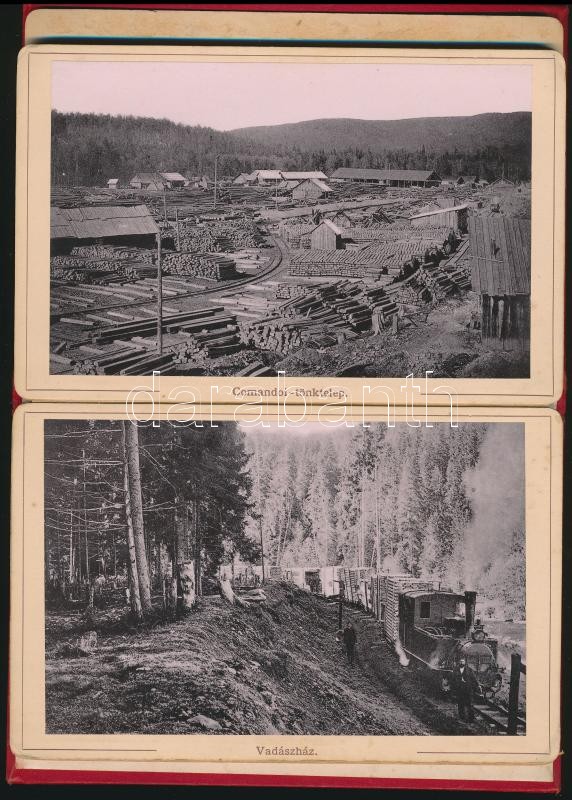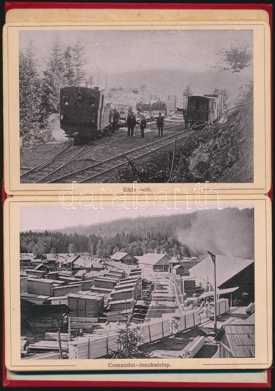 cca 1900 Album Az első Erdélyi erdőipar telepeiről, leporelló fotóalbum 16 db képpel, köztük fatelepek, sikló, gyár, Bogbán F. műterméből, díszes egészvászon kötésben, a kötéstől elvált, 17x11,5 cm / Photos of Transylvanian Timber industry, 16 photos in leporello album, 17x11,5 cm