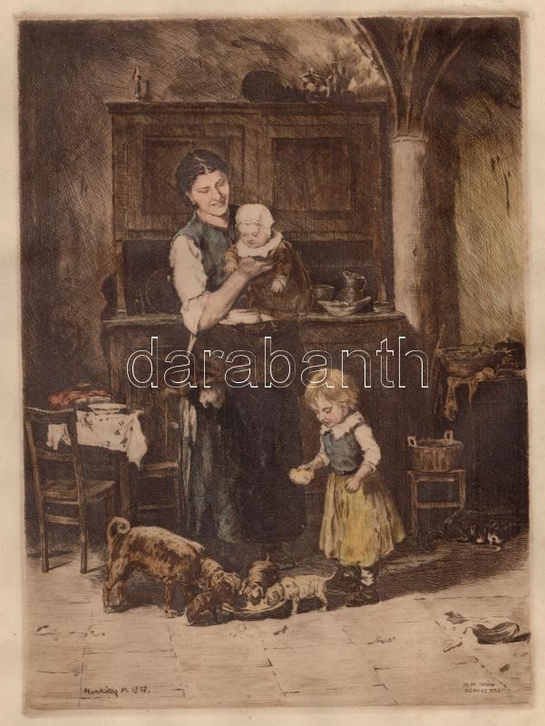 Kórusz József (1927-2010): Anya gyermekeivel, színezett rézkarc, jelzett a rézkarcon, papír, foltos, 31x22,5 cm. Munkácsy Mihály után Kórusz József 1953.