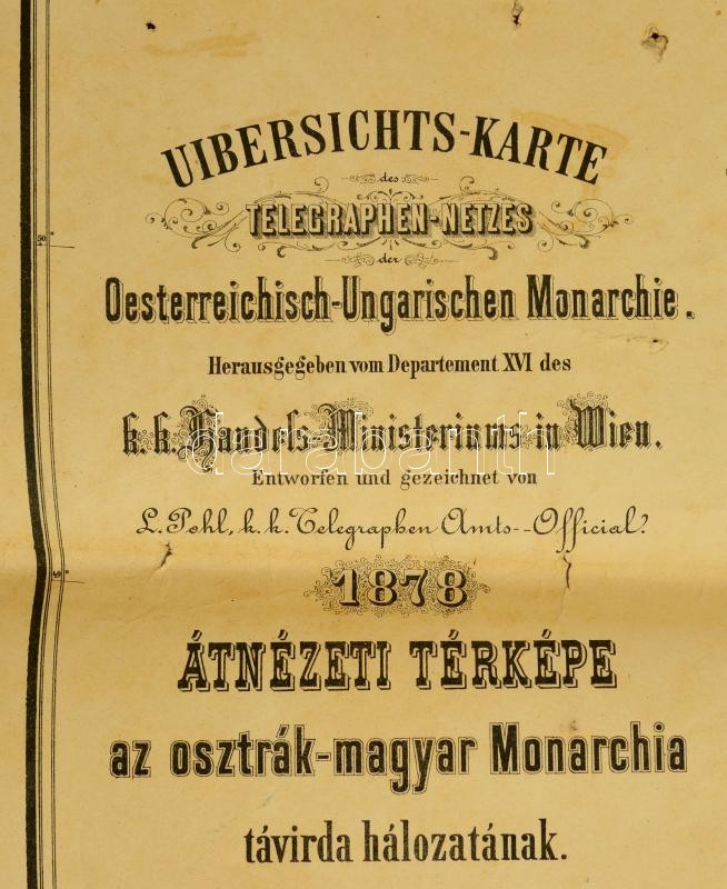 Beschreibung: 1878 Átnézeti térképe az Osztrák-Magyar Monarchia távírda hálózatának, K.k. Handelsministerium Wien, szakadt, 104x70 cm