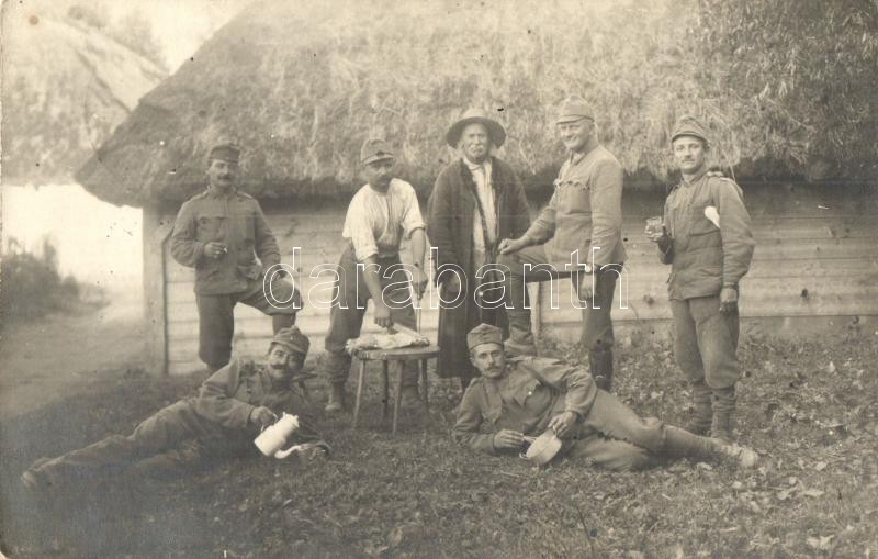 Beschreibung: 1916 M. Kir. 1. Népfölkelő Gyalogezred III. Zászlóalj katonái főzéshez készülve / WWI Hungarian soldiers, group photo