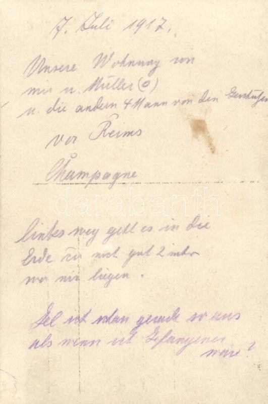 1917 Német katonák fedezékben Franciaországban Reims közelében / WWI G... https://www.darabanth.com/de/313-Fernauktion/313.0/Ansichtskarten/Militaria~500072/1917-Nemet-katonak-fedezekben-Franciaorszagban-Reims-kozeleben-WWI-German-soldiers-in-a-cove~II1713372