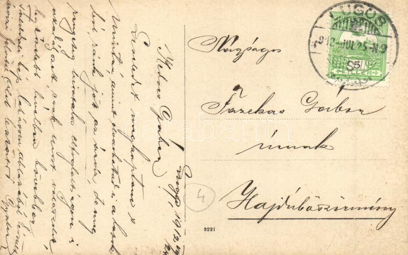 1912 Lugos, Lugoj; Árvízi utcakép, lovas ember az árvízben, Gyógyszertár a Szent Máriához, Kőrősy László, Rosenthal Adolf és Hegyesy üzlete. A felvétel a levélíró ablakából készült / flood in the town, flooded streets, pharmacy, shops. Photo was taken from the window of the letter writer