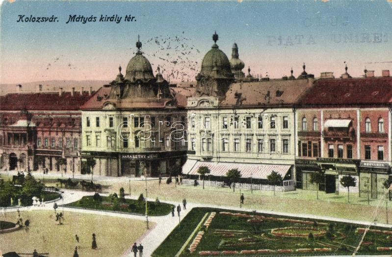 Beschreibung: Kolozsvár, Cluj; Mátyás király tér, Erdélyi Bank, Drogéria, Haraszthy Jenő üzlete / square, bank, pharmacy, shop "vissza" So. Stpl (EB)