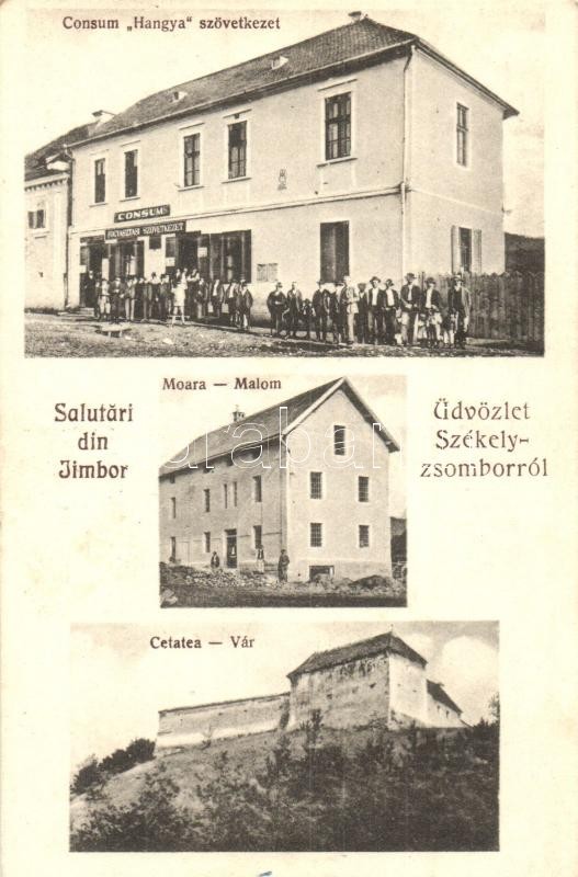 Székelyzsombor, Jimbor; Consum Hangya, Moara, Cetatea / Malom, Vár, Ha... https://www.darabanth.com/de/313-Fernauktion/313.0/Ansichtskarten/Siebenburgen~500007/Szekelyzsombor-Jimbor-Consum-Hangya-Moara-Cetatea-Malom-Var-Hangya-fogyasztasi-szovetkez~II1716634