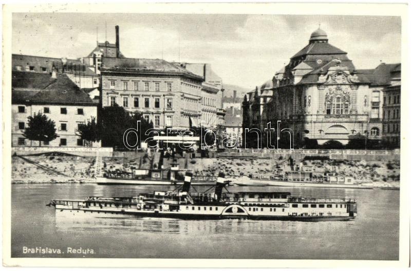 Pozsony, Pressburg, Bratislava; rakpart gőzhajóval / quay, steamship (... https://www.darabanth.com/de/313-Fernauktion/313.0/Ansichtskarten/Slowakei~500008/Pozsony-Pressburg-Bratislava-rakpart-gozhajoval-quay-steamship-azott-sarok-wet-corner~II1566735