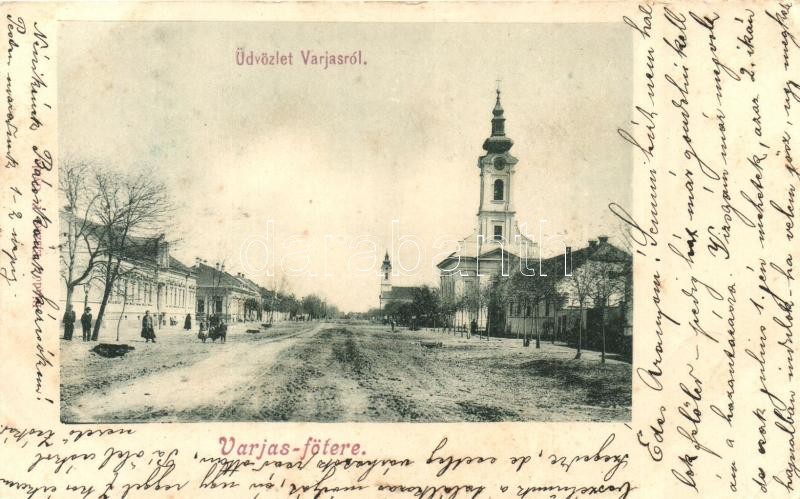 Beschreibung: Varjas, Varias; Fő tér, templomok. Eiszner F. kiadása / main square, churches (r)