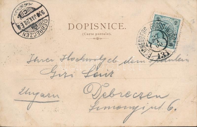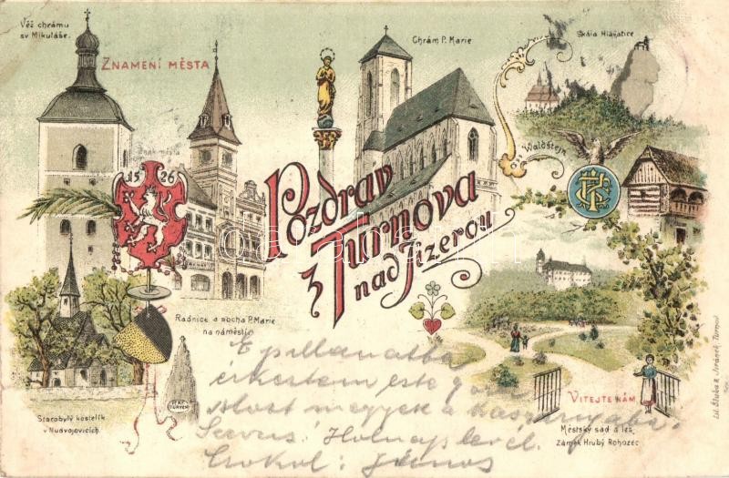 Turnov, Turnova nad Jizerou, Turnau; Znameni Mesta, Chrám cv. Mikulase, P. Marie, Skala Hlavatice, Waldstejn, Radnice a socha P. Marie na námesti, Kostelik v. Nudvojovicich, Zamek Hruby Rohozec / churches, town hall, castle. Art Nouveau litho (slightly wet damage)