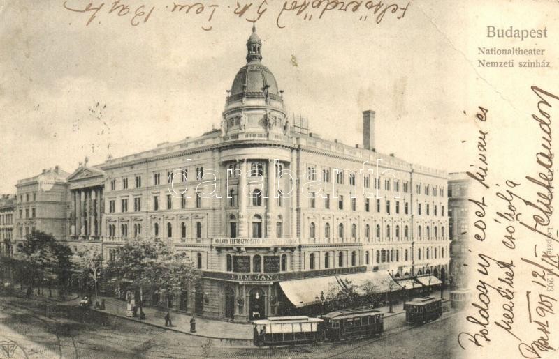 Beschreibung: Budapest VIII. Nemzeti színház, Hollandi Életbiztosító, Ehm János étterme, villamos (EB)