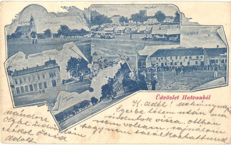 Beschreibung: Hatvan, iskola, városháza, Honvéd szobor, Takarékpénztár és posta, Járási bírói hivatal. floral (EK)