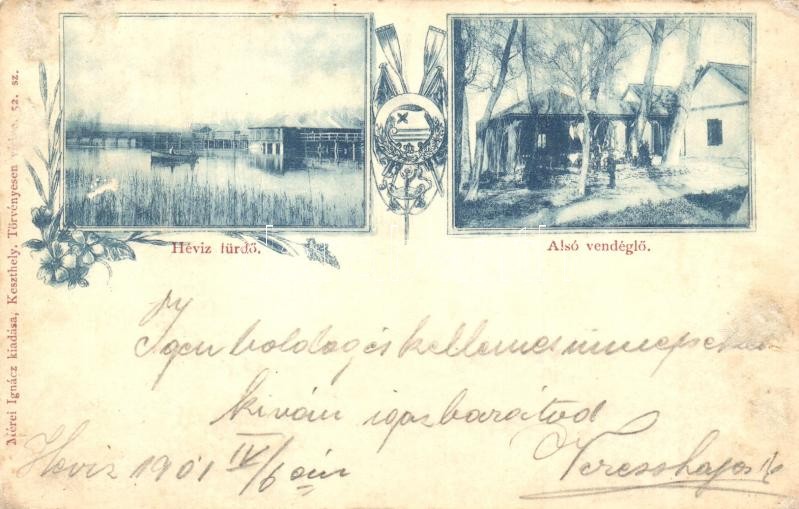 Beschreibung: Hévíz, fürdő és alsó vendéglő, étterem. Mérei Ignác kiadása, floral Art Nouveau (r)