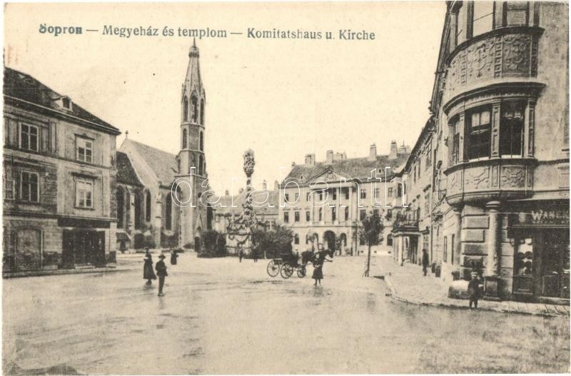 Beschreibung: Sopron, utcakép, Megyeház és templom, Wanek üzlete, Szentháromság szobor