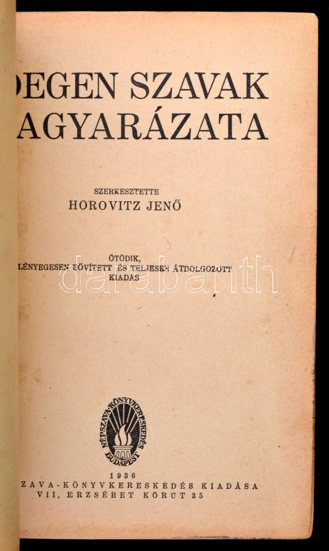 Idegen szavak magyarázata. Szerk.: Horovitz Jenő. Bp., 1936, Népszava. Ötödik, lényegesen bővített és teljesen átdolgozott kiadás. Átkötött bőrkötés, megviselt állapotban, kopottas, kissé viseltes borítóval, ceruzás bejelölésekkel, a hátsó szennylapon ceruzás jegyzettel.