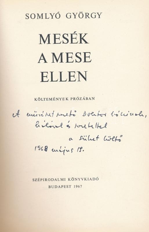 Somlyó György: Mesék a mese ellen. Költemények prózában. Bp., 1967, Szépirodalmi. Kiadói egészvászon-kötés, kissé szakadt kiadói papír védőborítóban. A szerző által dedikált Deutsch Aladár (1899-1973) főorvosnak.