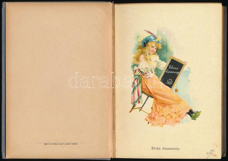Szabóné Nogall Janka: Elvira Kisasszony és más elbeszélések. Fiatal leányok számára. Budapest, 1903, Magyar Kereskedelmi Közlöny, 1 t. (címkép)+120 p.+1 sztl. lev. + 3 t. Színes litográfiákkal illusztrálva. Kiadói aranyozott, festett egészvászon kötés, Frankl és Werner könyvkötészete, kissé kopottas borítóval, illusztrációk közül egy hiányzik, de egyébként jó állapotban.