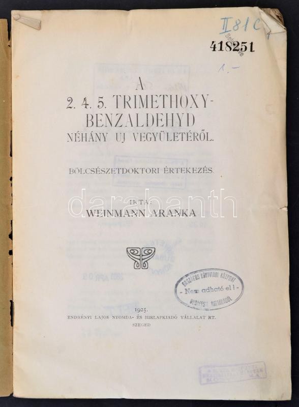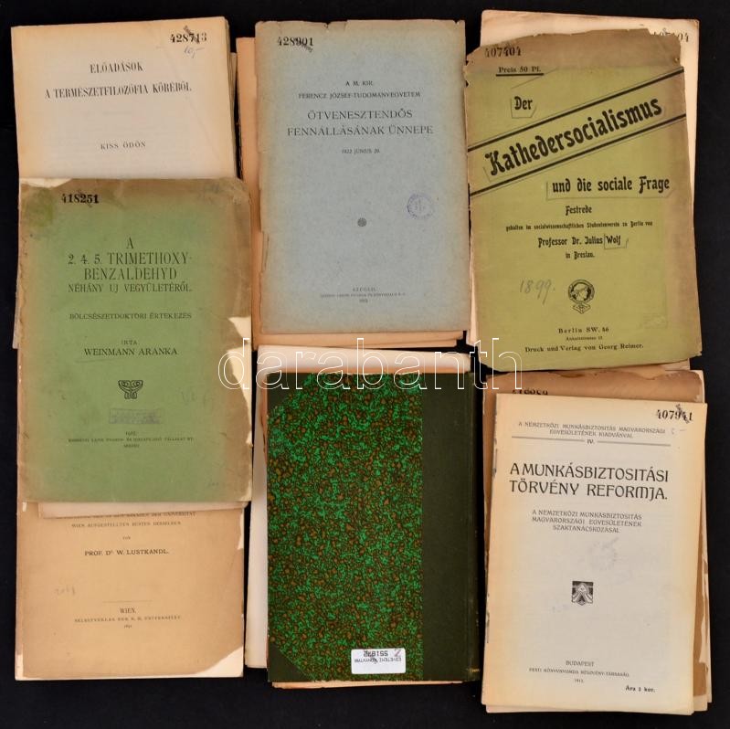 Vegyes könyvtétel, 12 db, többségében rossz állapotú könyvekkel. A Budapesti Magyar Királyi Tudomány-egyetem Könyvtárának Címjegyzéke. XIX. 1894-évi gyarapodás. Bp.,1895, Magyar Kir. Tud.egyetemi Könyvnyomda, 122 p. Átkötött félvászon-kötés, széteső állapotban, a végéről pár lap hiányzik, intézményi bélyegzővel. Leopold Pfaff: Rede auf Franz von Zeiller. Wien, 1891, Selbstverlag der K.K. Universität. Kiadói papírkötés, az elülső borító leszakadt a könyvtestről, intézményi bélyegzővel, német nyelven. Jakob Minor: Rede auf Grillparzer. Wien, 1891, Selbstverlag der K.K. Universität. Kiadói papírkötés, szakadt borítóval, az elülső borító leszakadt a könyvtestről, intézményi bélyegzővel, német nyelven. A munkásbiztosítási törvény reformja. A Nemzetközi Munkásbiztosítás Magyarországi Egyesületének szaktanácskozásai. Bp.,1913, Pesti Könyvnyomda Rt. Papírkötés, a borítója hiányzik, intézményi bélyegzővel. Dr. Szinnyei József: Ünnepi beszéd a Budapesti Kir. M. Pázmány Péter Tudományegyetem Tanévmegnyitó Közgyűlésében. 1923. évi szeptember hó 29.-én. Bp.,1924, M. Kir. Tudományegyetemi Nyomda. Papírkötés, a borítója hiányzik, intézményi bélyegzővel. Kiss Ödön: Előadások a természetfilozófia köréből. Bp.,1918, Lampel R. (Wodianer F. és Fiai.) Papírkötés, a borítója hiányzik, intézményi bélyegzővel. W. Lustkandl: Sonnefels und Kudler. Rede auf Josef von Sonnefels und Josef Kudler. Wien, 1891, Selbstverlag der K.K. Universität. Kiadói papírkötés, szakadt borítóval, az elülső borító leszakadt a könyvtestről, intézményi bélyegzővel, német nyelven. Karl Müller-Fraureuth: Sächsische Volkswörter. Dresden, 1906, Wilhelm Baensch. Papírkötés, a borítója hiányzik, intézményi bélyegzővel, német nyelven. Weinmann Aranka: A 2. 4. 5. trimenthoxy-benzaldehyd néhány új vegyületéről. Bölcsészdoktori értekezés. Szeged, 1925, Endrényi Lajos Nyomda- és Hírlapkiadó Vállalat Rt. Kiadói papírkötésben, szakadozott, hiányos borítóval, szakadozott lapokkal, intézményi bélyegzővel. A M. Kir. Ferencz József-Tudományegyetem ötvenesztendős fennállásának ünnepe. 1922. június 29.Szeged, 1923, Szeged Városi Nyomda és Könyvkiadó Rt. Kiadói papírkötés, rossz, széteső állapotban, szakadt borítóval, szakadt lappal, széteső kötéssel. Franz Lassel: Die Verfassung der evang. Landeskirche A. B. in Siebenbürgen. Kronstadt, 1871, Johann Gött und Sohn Heinrich. Papírkötésben, rossz állapotban, a borítója hiányos, szakadt, a hátsó borító elvált a könyvtesttől, a kötése szétvált, német nyelven, intézményi bélyegzővel. Julius Wolf: Der Kathedersocialismus und die sociale Frage. Berlin, 1899, Georg Reimer. Papírkötés, szakadt, hiányos borítóval, az elülső borító elvált a könyvtesttől, a kötése szétvált, német nyelven, intézményi bélyegzővel.