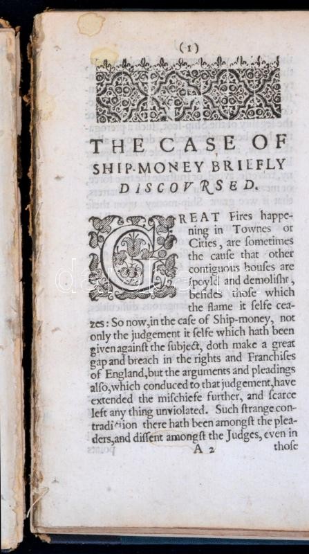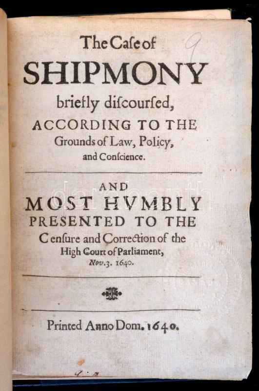 [Henry Parker]: The case of shipmony briefly discoursed, according to the grounds of Law and Policy and Consience. And most humbly presented to the censure and correction of the High Court of Parliement, Nov. 3. 1640. [London], 1640, [T. Harper], 47+ 9 p. Henry Parker (1604-1652) angol ügyvéd, politikai író, parlament párti propagandista, és pamflet író. A parlament egyik fő ideológusa. The case of shipmoney az egyik első és legfontosabb politikai röpirat a hosszú parlament időszakából. Modern félvászon kötés, angol nyelven, megviselt állapotban, a kötéstáblák leszakadtak a könyvtestről, az elülső védőlap, és a címoldal lejár, az elülső védőlapon bejegyzések. / [Henry Parker]: The case of shipmoney briefly discoursed, according to the grounds of Law and Policy and Consience. And most humbly presented to the censure and correction of the High Court of Parliement, Nov. 3. 1640. [London], 1640, [T. Harper], 47+ 9 p. Henry Parker (1604-1652) english barrister, political writer, parliamentary propagandist and pamphleteer. The each of the major ideologist of the Parliament. The case of shipmoney the each of the first and the most important political pamphlet from the Long Parliament era. Modern half-linen-binding, in english language, damaged, the front and the back covers came off from the spine, the shield page and the front page go down from the book, and some writings on the shield page.