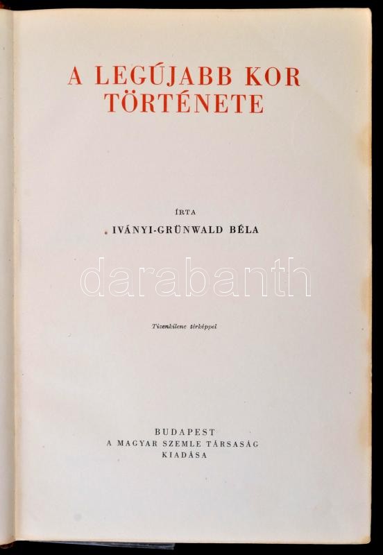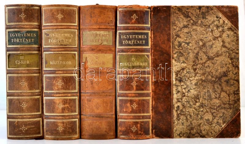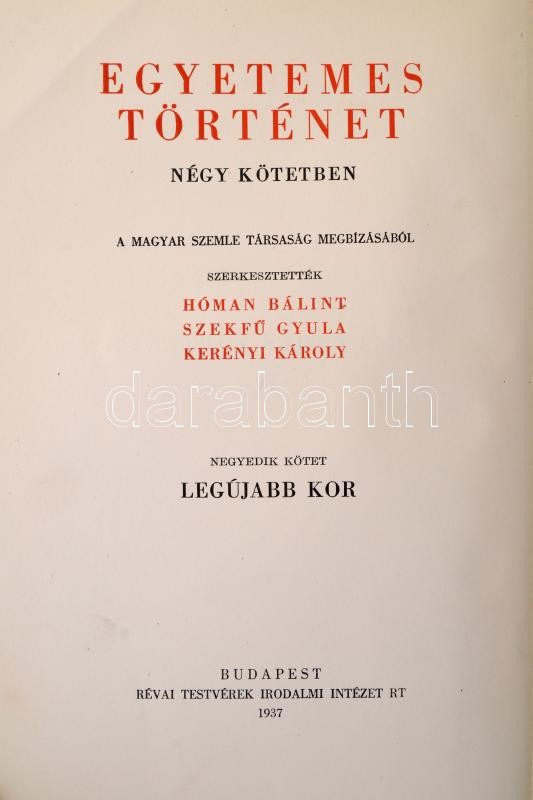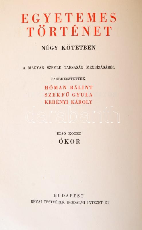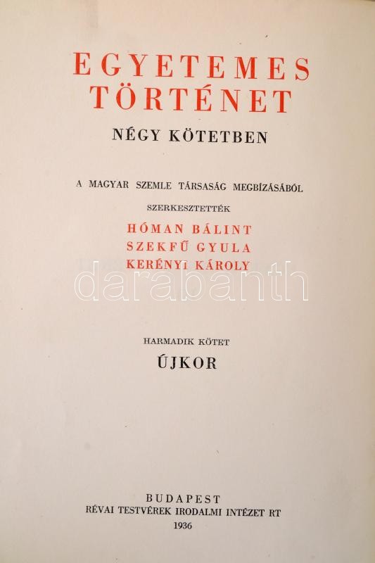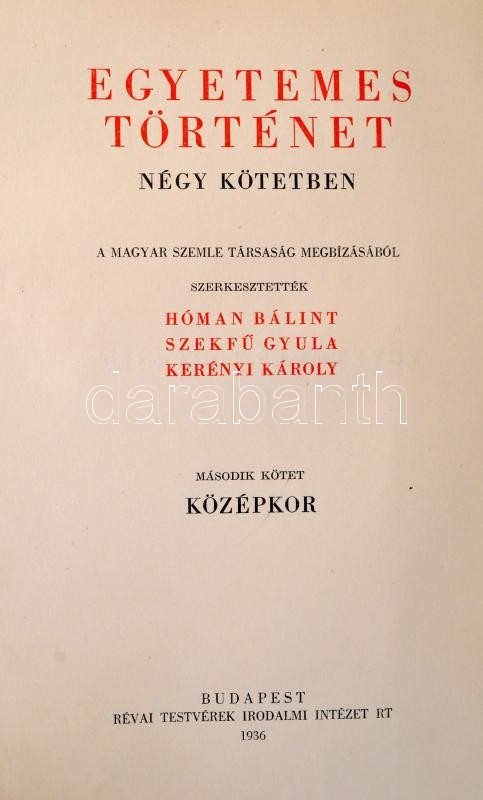 Hóman Bálint, Szekfű Gyula, Kerényi Károly (szerk.): Egyetemes történet. I.-IV. kötet. 1. Az ókor története. Szerk. Kerényi Károly. 2. Váczy Péter: A középkor története. 3. Hajnal István: Az újkor története. 4. Iványi-Grünwald Béla: A legújabb kor története. Bp.,1935-1937, Magyar Szemle Társaság, Révai Testvérek Irodalmi Intézet Rt. Kiadói aranyozott félbőr-kötés, kopottas gerinccel, az I. kötet gerincén sérüléssel, de belül jó állapotban, márványozott lapélekkel.