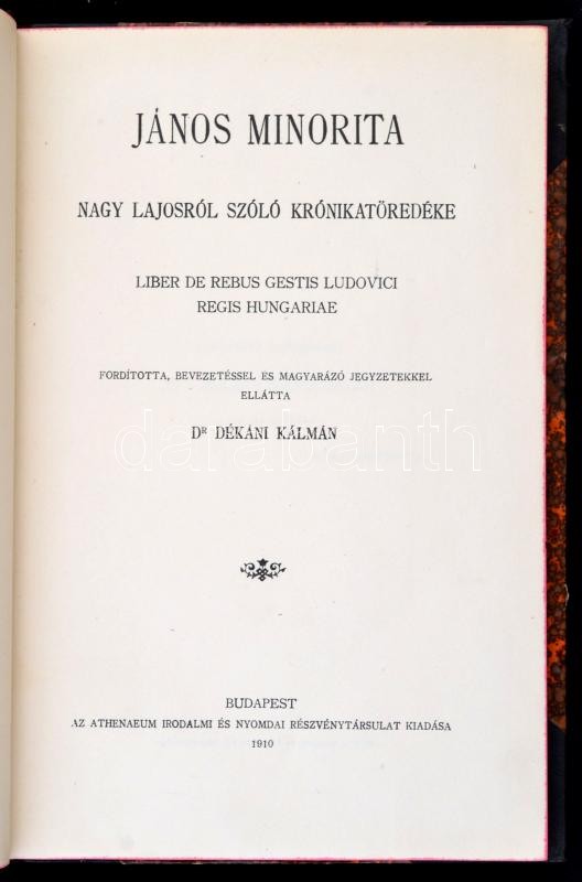 Beschreibung: János minorita Nagy Lajosról szóló krónikatöredéke. Liber de rebus gestis ludovici regis hungariae. FordÃtotta és bevezetéssel és magyarázó jegyzetekkel ellátta Dr. Dékáni Kálmán. Középkori Krónika XI. Szerk.: Dr. Gombos Ferenc Albin. Bp., 1910, Athenaeum, 95 p. Korabeli kissé kopottas félvászon-kötésben, festett lapélekkel.