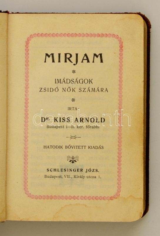 Dr. Kiss Arnold: Mirjam. Imádságok zsidó nők számára. Bp., (1903), Schlesinger. Kiadói egészbőr kötés, aranyozott lapszélek, gerincnél sérült, kopottas állapotban.