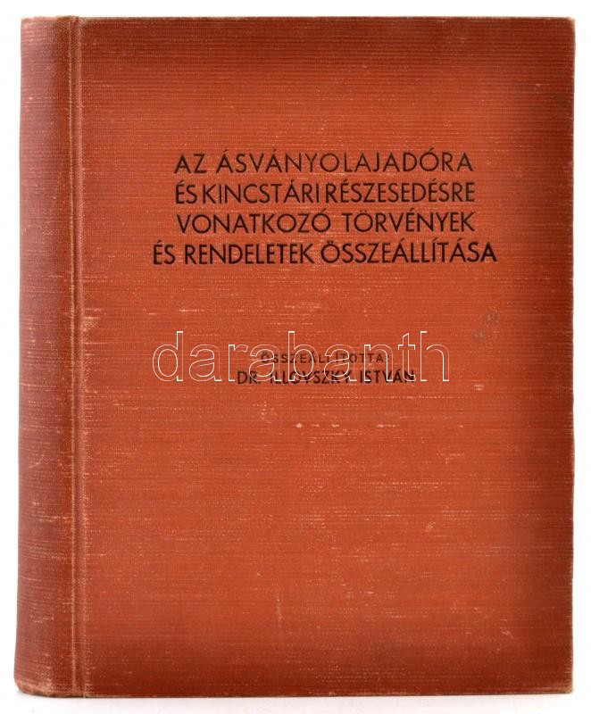 Az ásványolajadóra és kincstári részesedésre vonatkozó törvények és rendeletek összeállítása. Összeállította: Dr. Illovszky István. Dr. Czéh József miniszteri osztálytanácsos előszavával. Bp., 1941, Általános Nyomda és Grafikai Intézet Rt. Kiadói egészvászon-kötés.