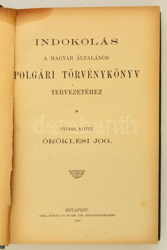 Indoklás a magyar általános polgári törvénykönyv tervezetéhez. Ötödik kötet. Öröklési jog. Budapest, 1902, Grill Károly Cs. és Kir. Udv. Könyvkereskedése, 463 p. Kiadói egészvászon-kötés, Gottermayer N.-féle, kötés