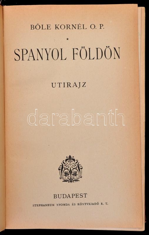 Bőle Kornél: Spanyol földön. Utirajz. Bp.,1927, Stephaneum Nyomda és Könyvkiadó Rt., 472 p. Fekete-fehér fotókkal és egy kihajtható térképpel illusztrálva. Kiadói egészvászon-kötés, kissé kopottas borítóval.