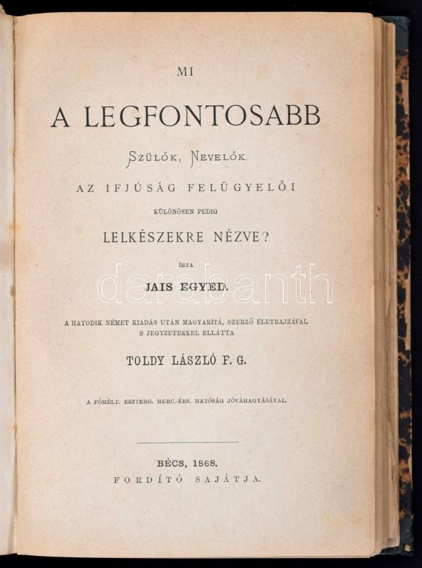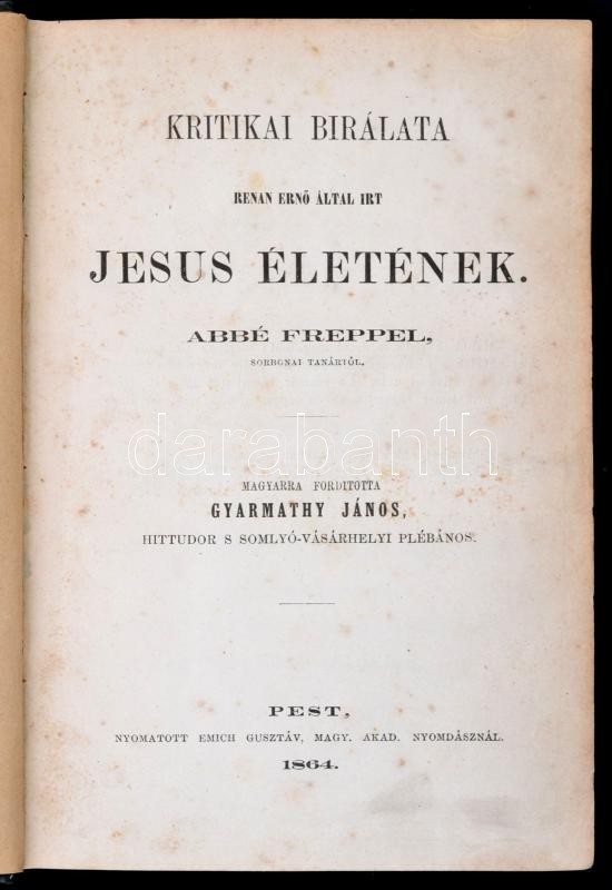Kolligátum 3 különféle vallási munkából: Freppel: Kritikai bírálata Renan Ernő által írt Jesus életének. Fordította: Gyarmathy János. Pest, 1864, Emich Gusztáv. Jais Egyed: Mi a legfontosabb szülők, nevelők az ifjúság felügyelői különösen pedig lelkészekre nézve? Fordította, a szerző életrajzával, s jegyzettekkel ellátta: Toldy László. Bécs, 1868, Fordító Sajátja,(Bécs Holzhausen Adolf-ny.) Roh J. A.: Komoly theolgiai felolvasások, könnyelmű politikusok számára. Roh J. A. nyomán közli Steiner Ádám. Veszprém, 1872, Krausz Ármin. Átkötött félvászon-kötés, kopott, kissé viseltes borítóval, a hátsó szennylap szakadt, XII+117+147+117 p.