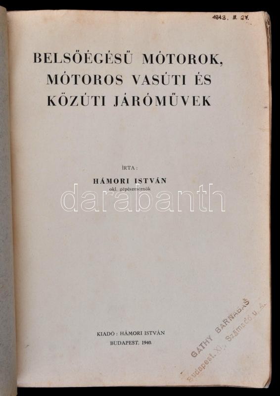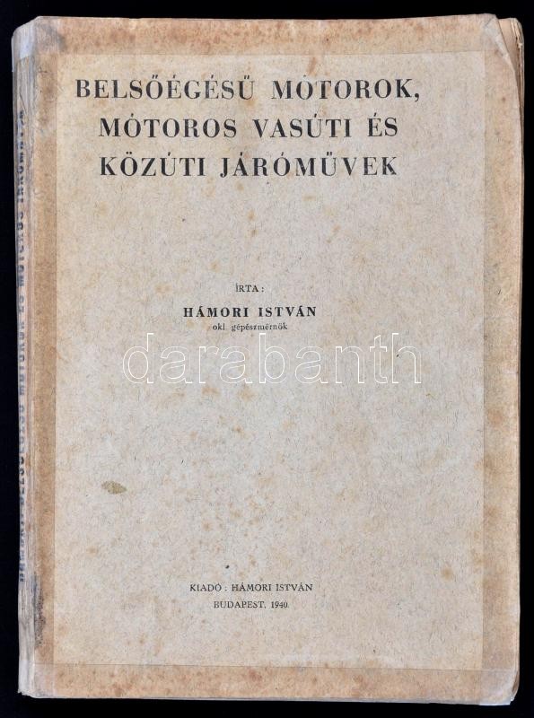 Hámori István: Belsőégésű motorok, mótoros vasúti és közúti járművek. Bp.,1940, Hámori István. Kiadói papÃrkötés, megviselt állapotban, javÃtott borÃtóval, kissé deformált, sérült, javÃtott kötéssel. Gáthy Barnabás (1926-) gépészmérnök névbélyegzÅ‘jével.