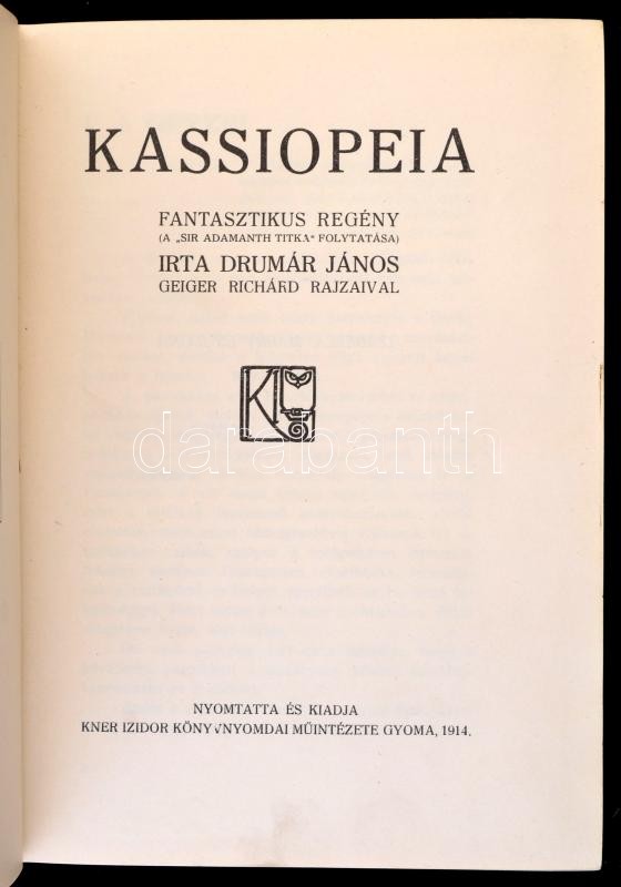 Drumár János: Kassiopeia. Fantasztikus regény. Geiger Richárd rajzaiva... https://www.darabanth.com/de/313-Fernauktion/313.0/Bucher/Futrinka-Auktion-Bucher~700008/Drumar-Janos-Kassiopeia-Fantasztikus-regeny-Geiger-Richard-rajzaival-Gyoma-1914-Kner-Izido~II1560160