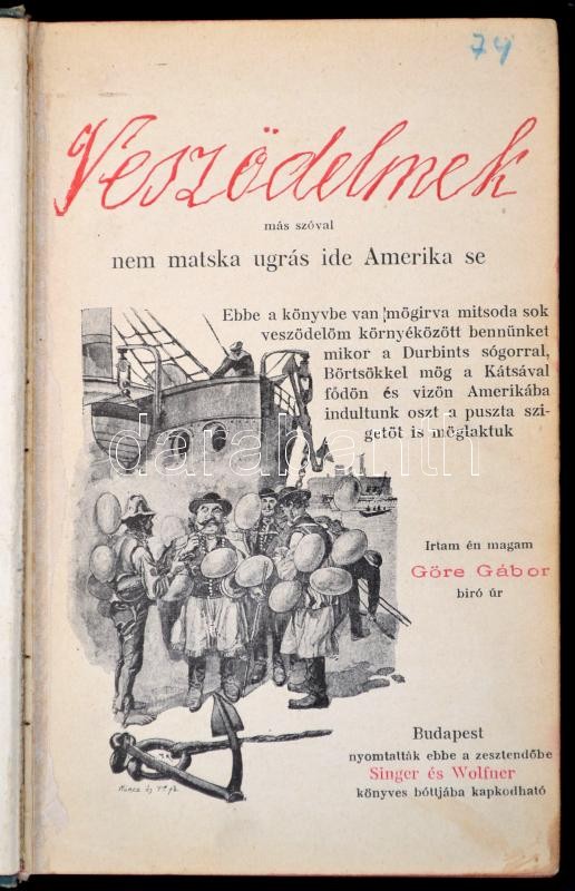 Gárdonyi Géza: Göre Gábor: Veszödelmek más szóval nem matska ugrás ide Amerika se. Mühlbeck Károly szövegközti rajzaival. Bp.,(1899),Singer és Wolfner. Első kiadás. Kiadói kopottas aranyozott, illusztrált egészvászon-kötés, benne illusztrált papírboríróval, hiányzó elülső szennylappal, festett lapélekkel.