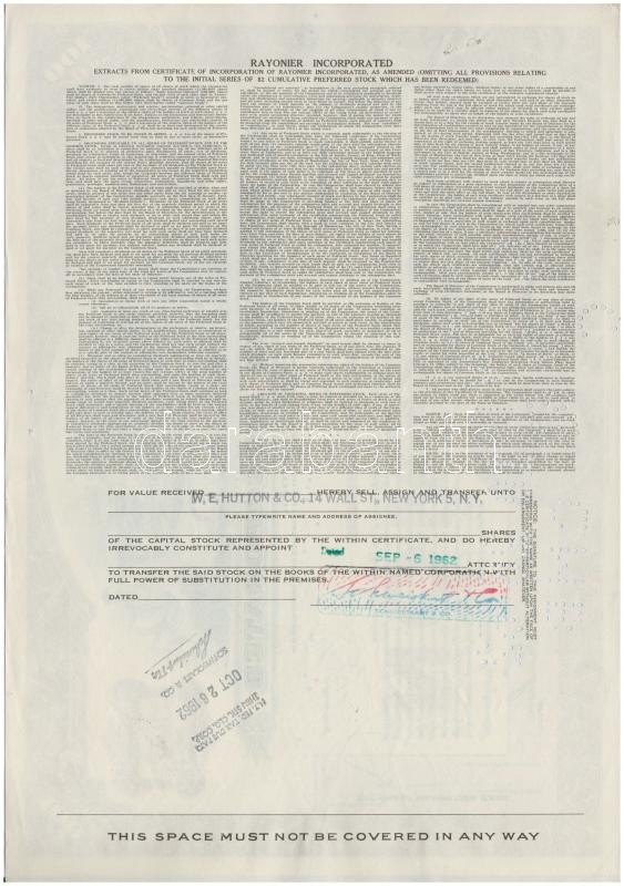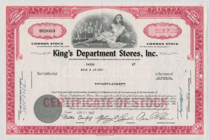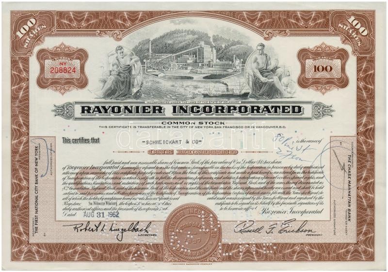 Amerikai Egyesült Államok 1962-1984. 10db-os vegyes részvény tétel, benne "Rayonier Incorporated", "The Anaconda Company", "Studebaker-Worthington", "United Park City Mines", "American Brands", "CCI Marquardt Corporation", "King's Department Stores" "Abacus Fund", "CompuSave Corporation" nagyrészt bélyegzésekkel, perforációval érvénytelenítve T:II-,III USA 1952-1978. 10pcs of shares, including ""Rayonier Incorporated", "The Anaconda Company", "Studebaker-Worthington", "United Park City Mines", "American Brands", "CCI Marquardt Corporation", "King's Department Stores" "Abacus Fund", "CompuSave Corporation", mainly with cancellations and invalidated with perforations C:VF,F