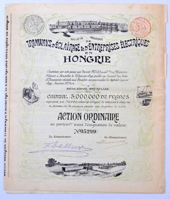 Belgium / Brussels 1899. "Société Anonyme de Tramways, d'Éclairge & d'Enterprises Électriques en Hongrie" share about 5.000.000 Francs, with stamps and coupons C:VG