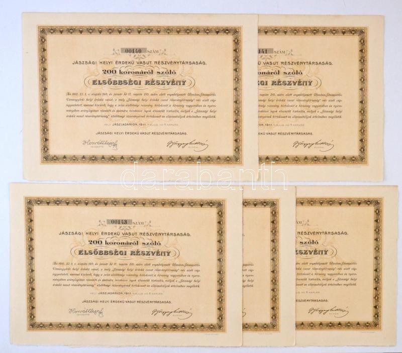 Beschreibung: Jászladány 1911. "Jászsági Helyi Érdekű Vasút Részvénytársaság" részvény 200K-ról (5x) sorszámkövetők T:I-