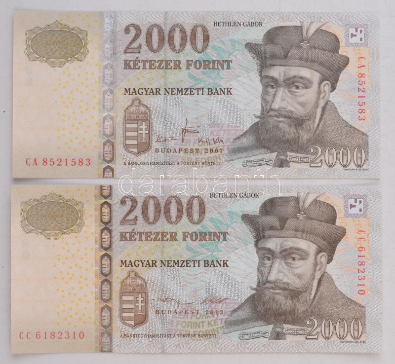 2007-2013. 2000Ft (2x) T:I,I- https://www.darabanth.com/de/313-Fernauktion/313.0/Numismatik/Ungarische-Banknoten~300007/2007-2013-2000Ft-2x-TI-I-~II1702414