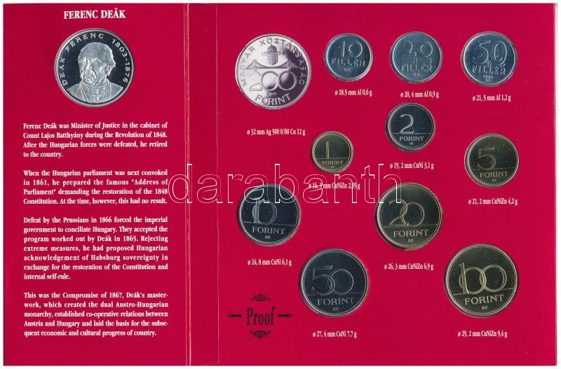 1994. 10f-200Ft (11xklf) forgalmi sor dísztokban, közte 1994. 200Ft Ag... https://www.darabanth.com/de/313-Fernauktion/313.0/Numismatik/Ungarische-Munzen-und-Munzen-mit-ungarischem-Munzzeichen~300008/1994-10f-200Ft-11xklf-forgalmi-sor-disztokban-kozte-1994-200Ft-Ag-Deak-TPP--Adamo-FO271~II1666642