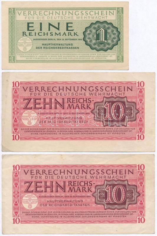 German Third Reich / Deutsche Wehrmacht 1944. 1 Mark + 10 Mark (2x) C:F nice paper