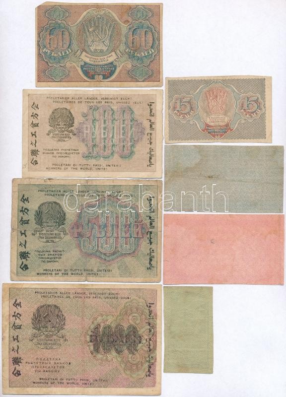 Russian Socialist Federated Soviet Republic 1919. 15 Rubles + 60 Rubles + 100 Rubles + 500 Rubles + 1000 Rubles + 1921. 500 Rubles + 1000 Rubles + 1922. 3 Rubles C:F,VG