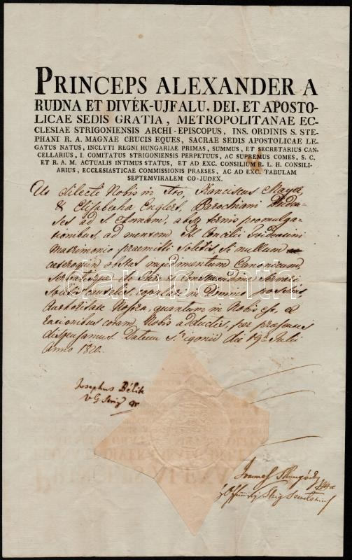 Beschreibung: 1820 Rudnay Sándor (1760-1831) esztergomi érsek levele, Bélik József (1757-1847) későbbi szepesi püspök ellenjegyzésével