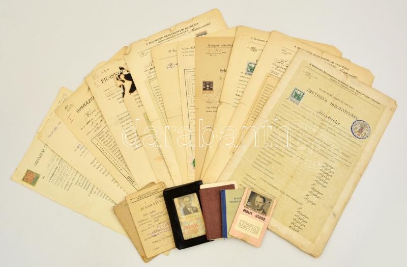 1913-1985 Vegyes papírrégiség tétel, ugyan attól a izraelita vallású személytől (Kéri Andor), 21 db: Iskolai bizonyítványok, igazolványok, halotti anyakönyvi kivonatok, közte a Budapesti Kereskedelmi Akadémia Felső Kereskedelmi Iskola papírjaival, bizonyítványaival (2db), érettségi bizonyítványaival (2db, 1917, 1919 (másolat)), és igazolványával (1db), rajta Szuppán Vilmos (1854-1933) igazgató, Dr. Schack Béla (1859-1936) kir. főigazgató, kir. udvari tanácsos, szakíró,filológus, vallás- és közoktatásügyi minisztérium kereskedelmi oktatási ügyosztály vezetőjének, a kereskedelmi szaktanár képzés megszervezőjének aláírásaival, valamint számos neves tanár aláírásával, közte: Dr. Simonyi Jenő (1860-cca.1930) földrajzi szakíró aláírásával, valamint a tapolcai izraelita hitközség 2 db halotti anyakönyvi kivonata (1939), budapesti illetőségi bizonyítványa (1917), erkölcsi bizonyítvány (1922), valamint Terézvárosi Auto és Motor Club Bélyeggyűjtő Szakosztályának igazolványával (1944), és a Magyar Bélyeggyűjtő Egyesületek Országos Szövetségének igazolványával, FÉVBE bebélyegzéssel (1950), számos okmánybélyeggel, változó állapotban.