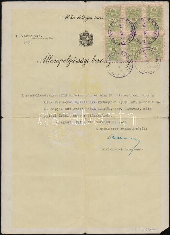 Beschreibung: 1944 Magyar állampolgársági bizonyítvány madéfalvi lakos részére, okmánybélyegekkel