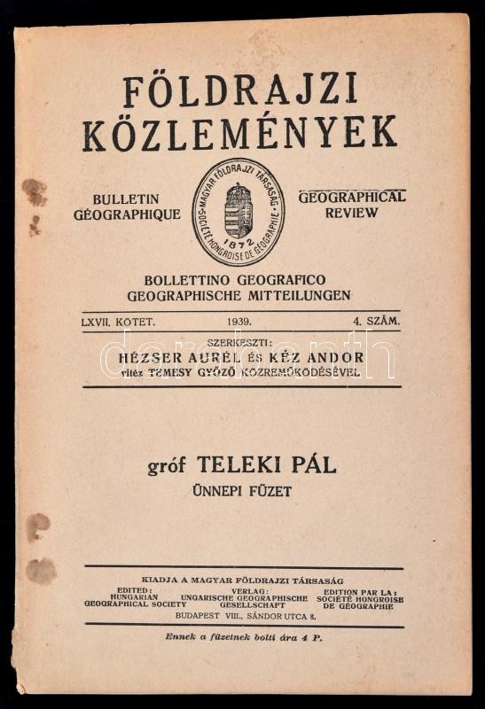 1939 Földrajzi közlemények. LXVII. kötet. 4. sz. Szerk.: Hézser Aurél-Kéz Andor-Temesy Győző. Bp., Magyar Földrajzi Társaság. Papírkötés, egy kihajtható illusztráció kijár.