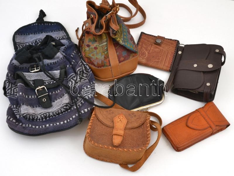 Beschreibung: Vegyes bolha tétel, összesen 7 db: Kis bőr válltáska, műbőr-textil szütyő, mini textil hátizsák, bőr pénztárcák, bőr tolltartó