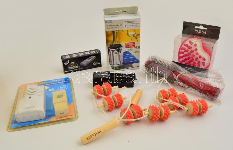 Beschreibung: Vegyes bolha tétel, összesen 7 db: cigaretta töltők, masszírozók, vezeték nélküli csengő, palackhűtő, hajkefe