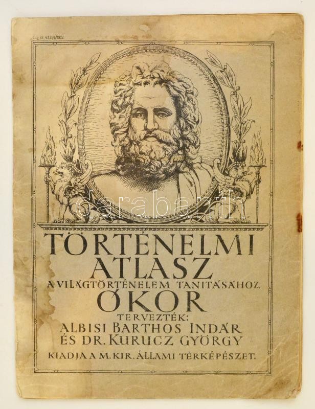 cca 1928 Történelmi atlasz a világtörténelem tanításához. Ókor. Szerk.: Albisi Barthos Indár, Kurucz György. Bp., Magyar Királyi Állami Térképészet. Papírkötésben, rossz állapotban, foltos, ceruzás bejegyzésekkel, egy ív kijár.