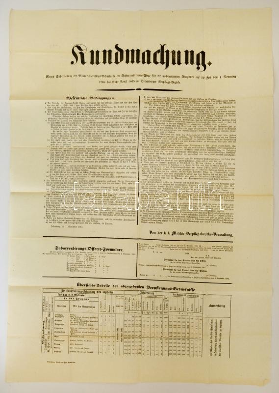 Beschreibung: 1864 Hirdetmény katonák ellátásáról különböző településeken (Csepreg, Sárvár, Körmend), német nyelven, jó állapotban, 88x62 cm